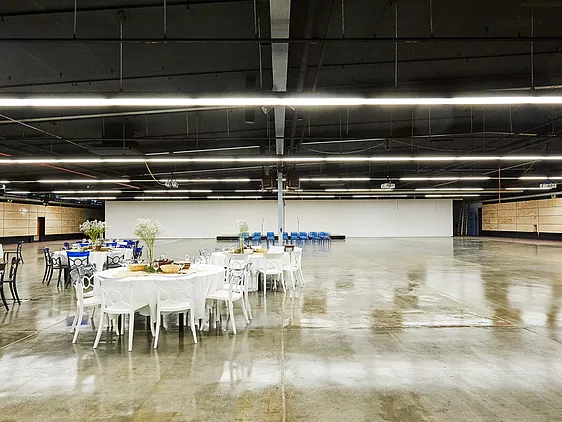 抛光混泥土地面,镶板木墙,高天花板,低天棚悬挂式高亮照明灯,非常适合大型节日活动,运动会,或派对。