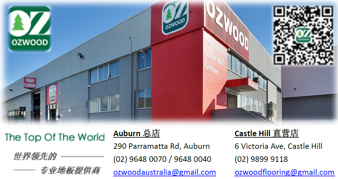 OZWOOD是目前悉尼最大的地板商场,常年销售与安装包括金钢板,实木复合地板,实木地板,塑胶地板等全系列地板产品。OZWOOD总店位于290 Parramatta Road, Auburn,另有一家直营店位于6 Victoria Ave, Castle Hill。