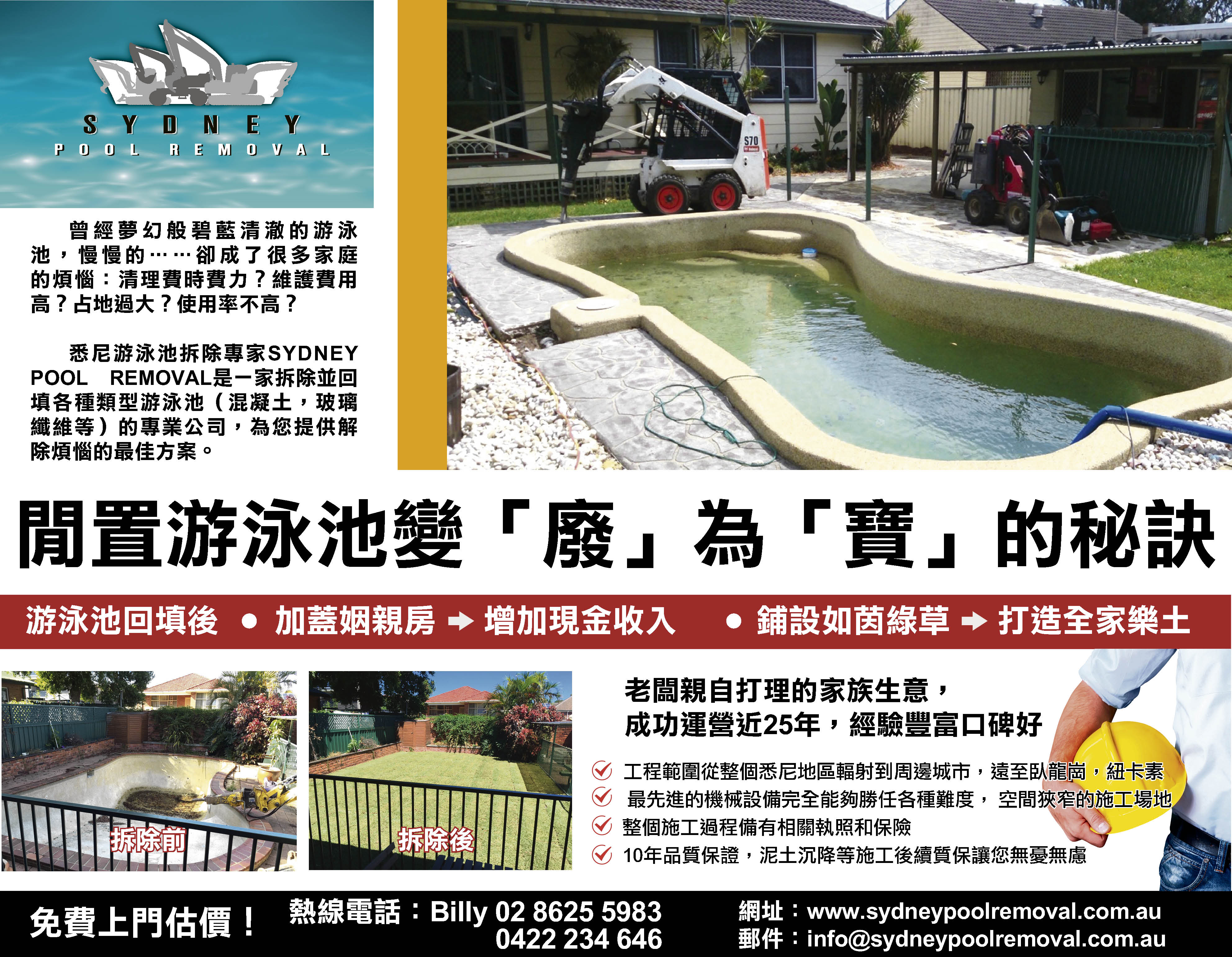 Sydney Pool Removal讓您閑置游泳池變「廢」為「寶」。老闆親自打理的家族生意,成功運營近25年,經驗豐富口碑好。 1. 工程範圍從整個悉尼地區輻射到周邊城市,遠至卧龍崗,紐卡素。 2. 最先進的機械設備完全能夠勝任各種難度, 空間狹窄的施工場地。 3. 整個施工過程備有相關執照和保險。 4. 10年品質保證,泥土沉降等施工後續質保讓您無憂無慮。免費上門估價!